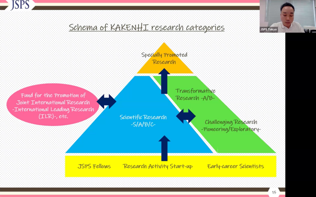 The session took place online from 09:00–09:45 CEST / 16:00–16:45 JST and attracted around 30 participants. Mr. Naritake Abe (Head of Research Aid Division III, Research Program Department, JSPS Tokyo Office) introduced various grant schemes in JSPS as well as Introduction about the KAKENHI International Leading Research Program which is a main topic of the session. The event concluded with a lively Q&A session, and the speaker addressed numerous questions from attendees with informative responses.